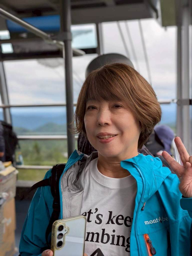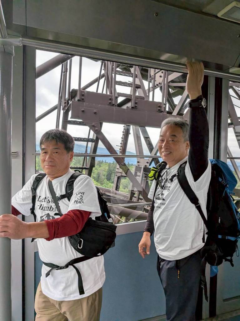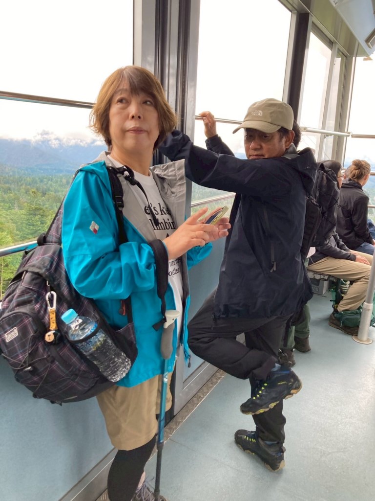 行は天候曇り、ロープーウェイ山頂は14度Cと心地よい気温で登山日和